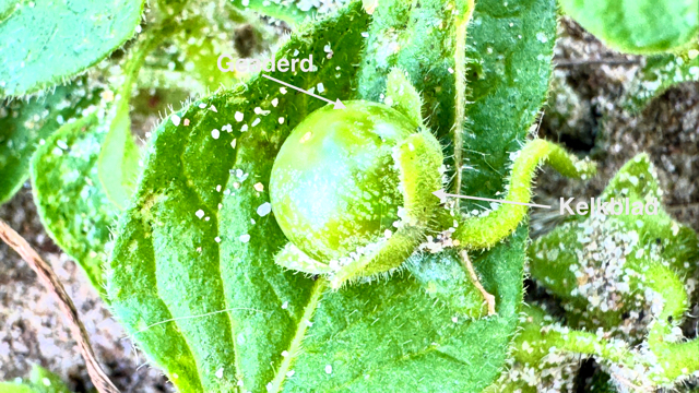Het bovenstandig vruchtbeginsel groeit na bestuiving en bevruchting uit tot een bes. Deze glanst aanvankelijk heel sterk en is groen van kleur met licht enigszins geelachtige aderen. De bes groeit uit tot maximaal bijna 1,5 cm in doorsnede en kleurt dan naar donker bruin-paars.