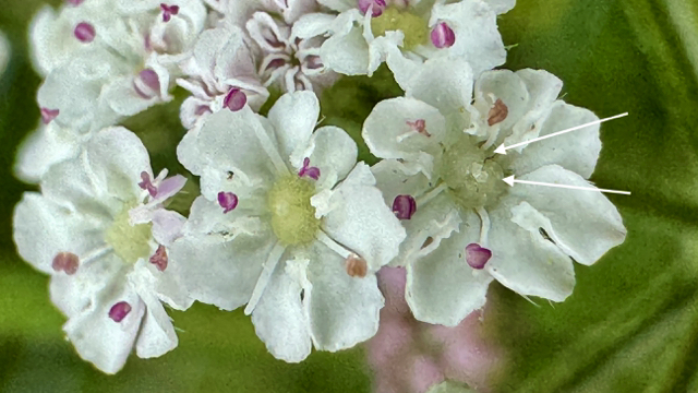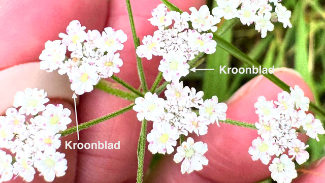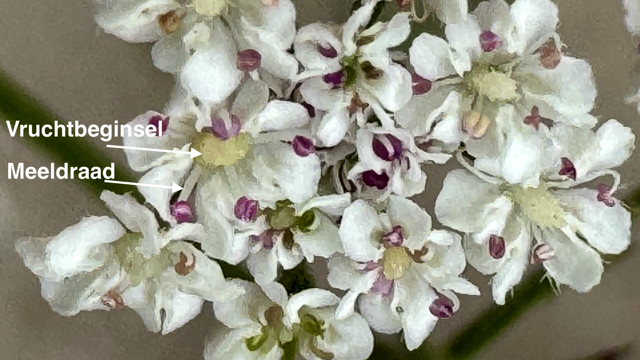 De bloeiwijzen bestaat uit een samengesteld scherm aan het eind van de vertakkingen van de stengel. Het samengestelde scherm heeft onder het scherm een omwindsel dat meestal uit vijf omwindselbladeren bestaat. Het aantal schermpjes dat het samengesteld scherm vormt is meer dan vijf en ook ieder schermpje heeft een meerbladig omwindseltje. De vijftallige bloemen zijn in de knop roze en de kleur van de vijf kroonbladen is wit tot roze. De vijf kroonbladen zijn zo diep uitgerand dat ze bijna lijken te bestaan uit 10 kroonbladen. De meeldraden wisselen af met de kroonbladen. De priemvormige kelktanden zijn goed te zien, wat wel wat afwijkend is ten opzichte van veel soorten uit de Schermbloemenfamilie.