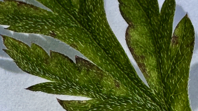 Aan de stengel staan de bladeren met een schedevormige bladsteel verspreid. De bladeren zijn in omtrek driehoekig en 2 tot 3 voudig geveerd. De bladeren lijken daardoor wel op die van Fluitenkruid en Dolle kervel, maar ze zijn meer glanzend groen dan de doffe bladeren van laatstgenoemde. De deelblaadjes zijn fijn ingesneden en kunnen aan hun top gezaagd zijn. Dit laatste zie je niet bij de twee andere Doornzaadsoorten.