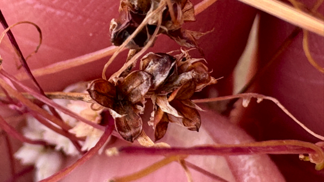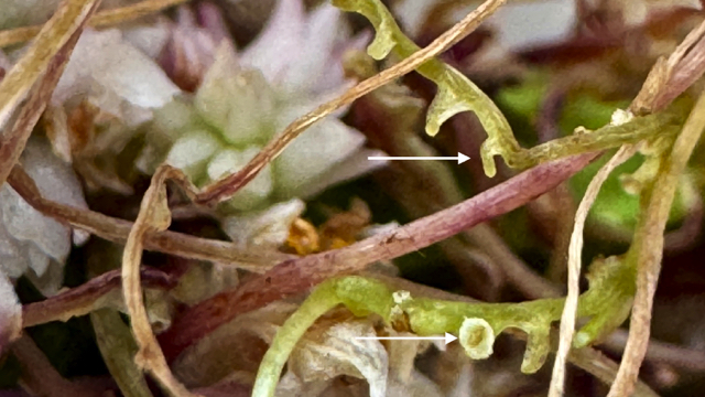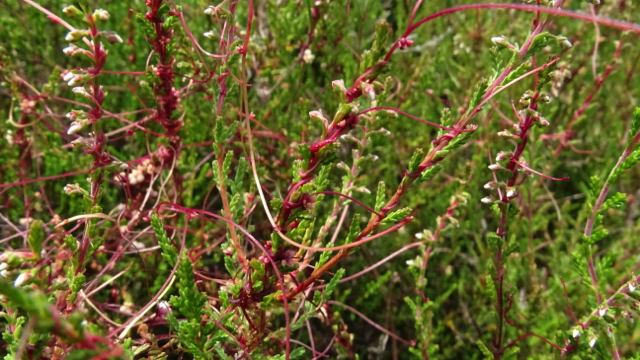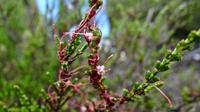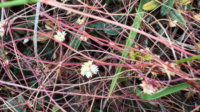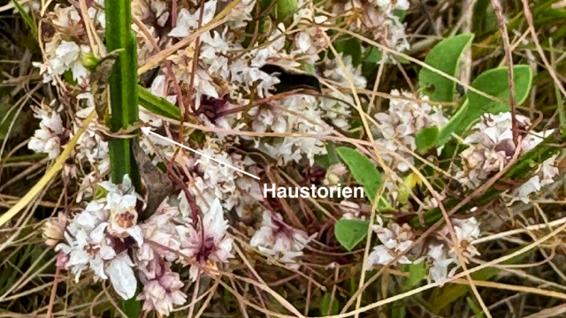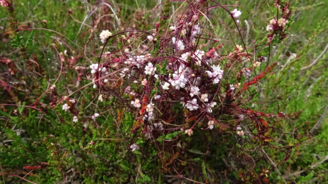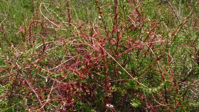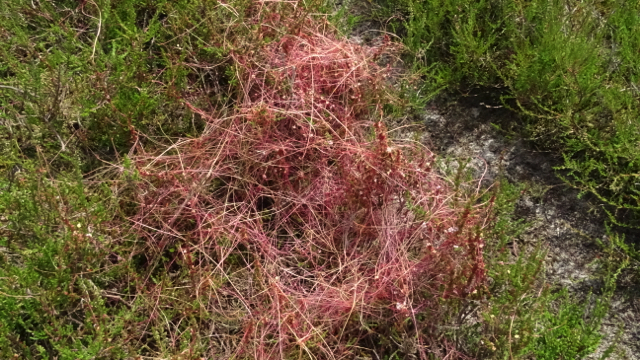 Een echte parasiet op andere plantensoorten zoals heide of bremsoorten, maar ook op Grote tijm is Klein warkruid, Cuscuta epithymum. Je herkent de soort aan de lange dunne stengels die als een wirwar tussen de onderdelen van de waardplant lijken doorgeweven. Aan die dunne een beetje rood aangelopen stengels zitten geen bladeren en de kluwens van kleine bloemen zitten in de oksels van schubben. Door de windende stengels kunnen Warkruiden hun waardplant zelfs verstikken en heten uit dien hoofde Duivelsnaaigaren, een heel toepasselijke naam.