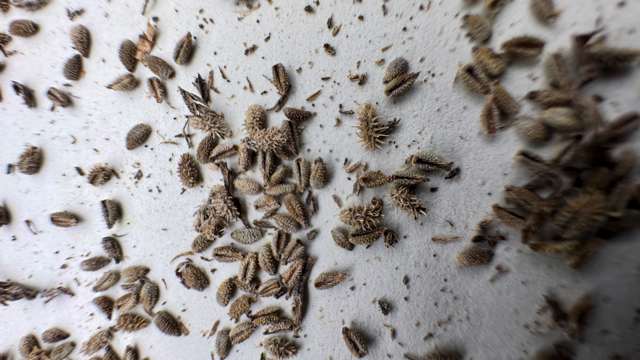Als bijzonderheid is hier de merkwaardige niet symmetrische bezetting van de splitvruchten met op de ene vruchthelft stekels en op de andere vruchthelft knobbeltjes.