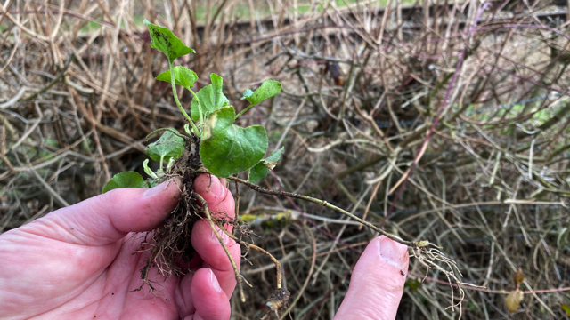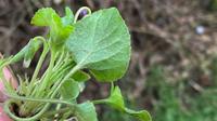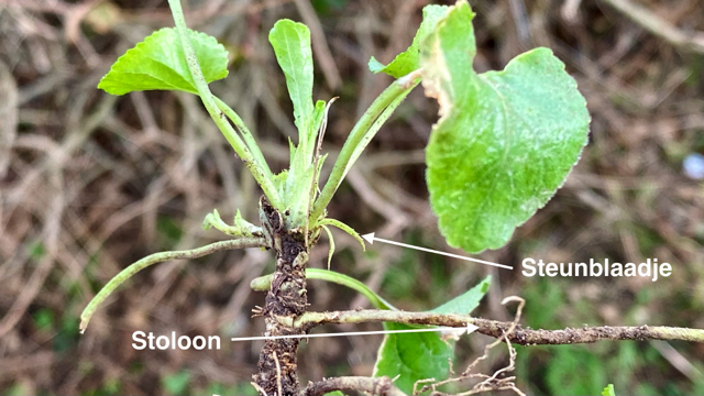 De donkergroene bladeren staan verspreid aan de kruipende stengels; ze zijn hartvormig, rond aan de top en bijna nooit spits toelopend. De bladrand is gekarteld. Onderaan de bladsteel staan twee grote langwerpig-driehoekige steunblaadjes.