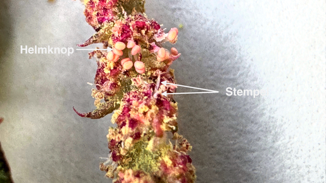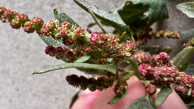 De bloeiwijzen aan de toppen van de stengels zijn aar tot pluimvormig en de kleine bloemen zitten in clusters of kluwens bijeen. Je vindt in de bloeiwijze twee typen bloemen door elkaar, namelijk mannelijk bloeiende meeldraadbloemen en vrouwelijke stamperbloemen. De mannelijk bloeiende bloemen hebben een bloemdek met vijf bloemdekbladen en vijf meeldraden die op de bloemdekbladen staan ingeplant. De stamperbloemen hebben een bovenstandig vruchtbeginsel met een stijl en twee stempellobben. Er staat geen bloemdek omheen, maar er zijn twee zogenaamde steelblaadjes die het vruchtbeginsel omvatten en als een beursje omsluiten. Deze steelblaadjes zijn aan de vlakke voet met elkaar vergroeid en blijven om de vrucht zitten. Deze steelblaadjes zijn driehoekig en enigszins getand. Er kunnen overigens altijd wel een paar tweeslachtige bloemen gevonden worden in de bloeiwijze.