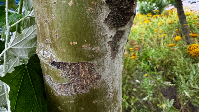 Deze boom kan tot zo'n 30 m hoog worden en heeft een brede kruin. De stam is lichtgrijs of vaalwit van kleur en heeft ruitvormige zwarte holtes. Onderaan is de schors gegroefd.
