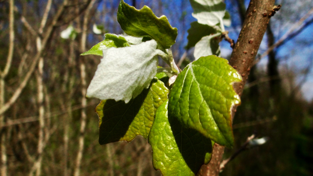 De knoppen zijn in het voorjaar witviltig en de jonge bladeren hebben een lichtgroene kleur aan de bovenkant en van onderen zijn ze ook witviltig. Dat laatste blijft bij de ouder wordende bladeren zo. De bovenkant wordt dan donkergroen. De vorm van de bladeren is ook heel typisch. Ze zijn handvormig gelobd tot gespleten en de lobben lopen tot op 1/3 tot 1/2 van de bladomvang. Aan deze witviltige onderkant van de bladeren is de Witte abeel gemakkelijk te herkennen.
