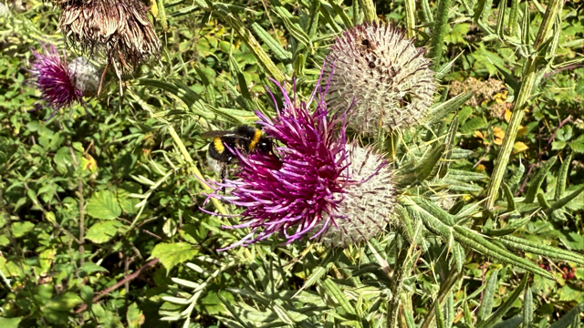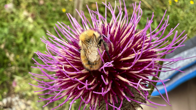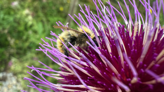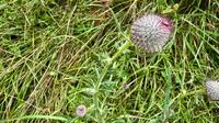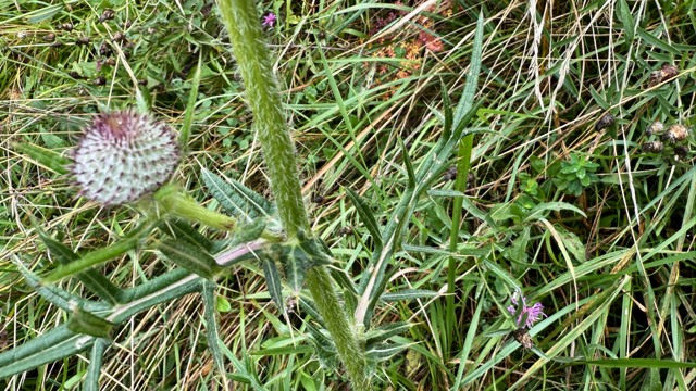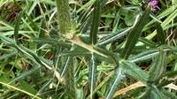 De opmerkelijke bolvorm van het (nog gesloten) grote hoofdje is erg kenmerkend voor deze soort uit het geslacht Vederdistel.