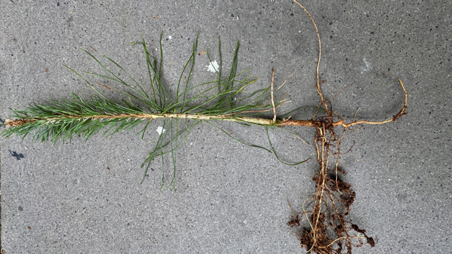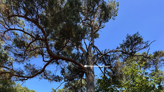 Op het flinke hartwortelstelsel staan de stammen, die lang niet altijd recht zijn en ze dragen een piramidale kroon. De aanvankelijk licht gekleurde bruin tot roodachtige stam krijgt later naarmate de leeftijd vordert een donkere gegroefde grijze schors. Jonge takken blijven roze, maar verkleuren later ook donker. In de grijze schors kun je de roze kleur vaak nog zien doorschemeren. De roodbruine knoppen kleven niet, omdat ze geen hars bevatten. De lange gebogen en stevige grijsgroene naalden, tot 25 cm lang, staan met zijn tweeën ingeplant op zogenaamde kortloten; ze hebben een scherpe punt en kunnen derhalve naast lijnvormig ook wel priemvormig genoemd worden. Op doorsnee zie je in de naalden een centraal gelegen harskanaal.