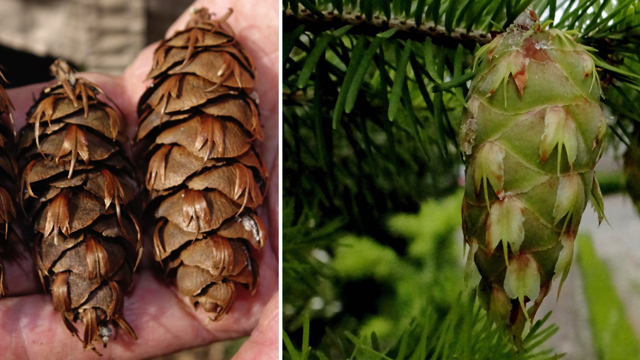 Mannelijke en vrouwelijke voortplantingscellen vind je in kegelvormige structuren aan dezelfde boom. Het is dus een eenhuizige soort. De mannelijk bloeiende kegeltjes hangen niet ver van de toppen van de takeinden. Als ze hun stuifmeel of pollen hebben vrij gegeven aan de lucht, vallen ze af. Je vindt deze derhalve enkel vroeg in het voorjaar aan de bomen. De vrouwelijk bloeiende kegels blijven langer aan de boom; ze ontstaan aan de uiteinden van de twijgen, vangen het pollen op vanuit de lucht en daarna gaan ze hangen. Deze rijpende vrouwelijke kegels zie je nog een hele tijd. Ze kunnen 5 tot 10 cm lang worden. Aan een afgevallen vrouwelijke kegel kun je zien dat om de zaadknoppen twee zaadschubben zitten en dat dit geheel door een dekschub wordt begeleid. De dekschub steekt verder uit de kegel uit dan de zaadschubben en is drietandig. De bruine zaden kunnen heel gemakkelijk kiemen in onze contreien, waardoor er snel een verjonging van het bosbestand optreedt en de soort ook gemakkelijk inburgert in het noordwesten van Europa.